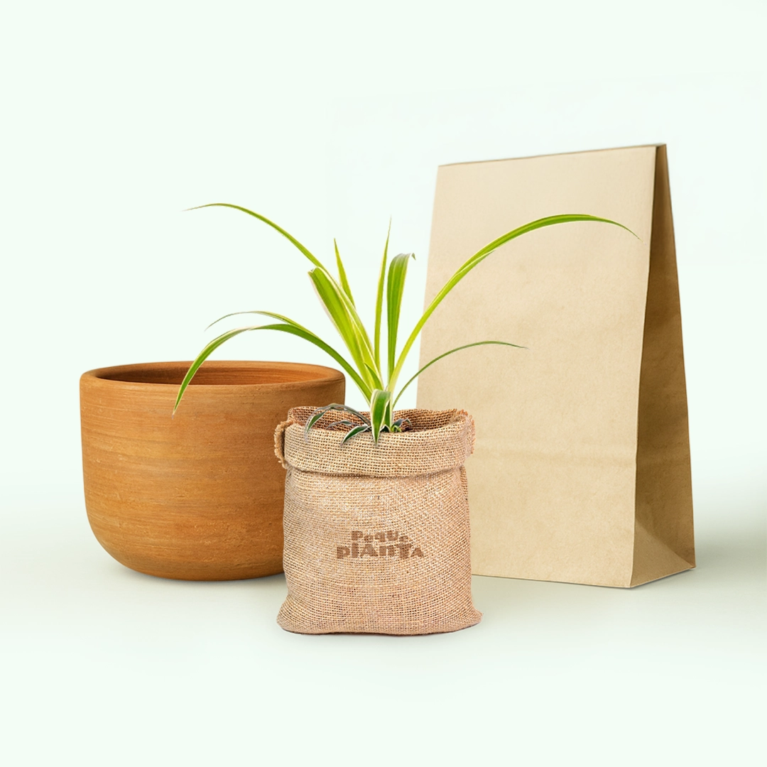 Cada set incluye un Chlorophytum Comosum de aproximadamente 20cm de altura, perfectamente anidada en una bolsa de arpillera para conservar la humedad en su traslado. También incluye una maceta de barro artesanal que mide aproximadamente unos 12cm de alto y 15cm de diámetro, ideal para colocar en cualquier rincón de tu hogar u oficina. Además, recibirás 1 litro de nuestro sustrato, diseñado para proporcionar el equilibrio perfecto de drenaje y nutrición para el Chlorophytum Comosum.