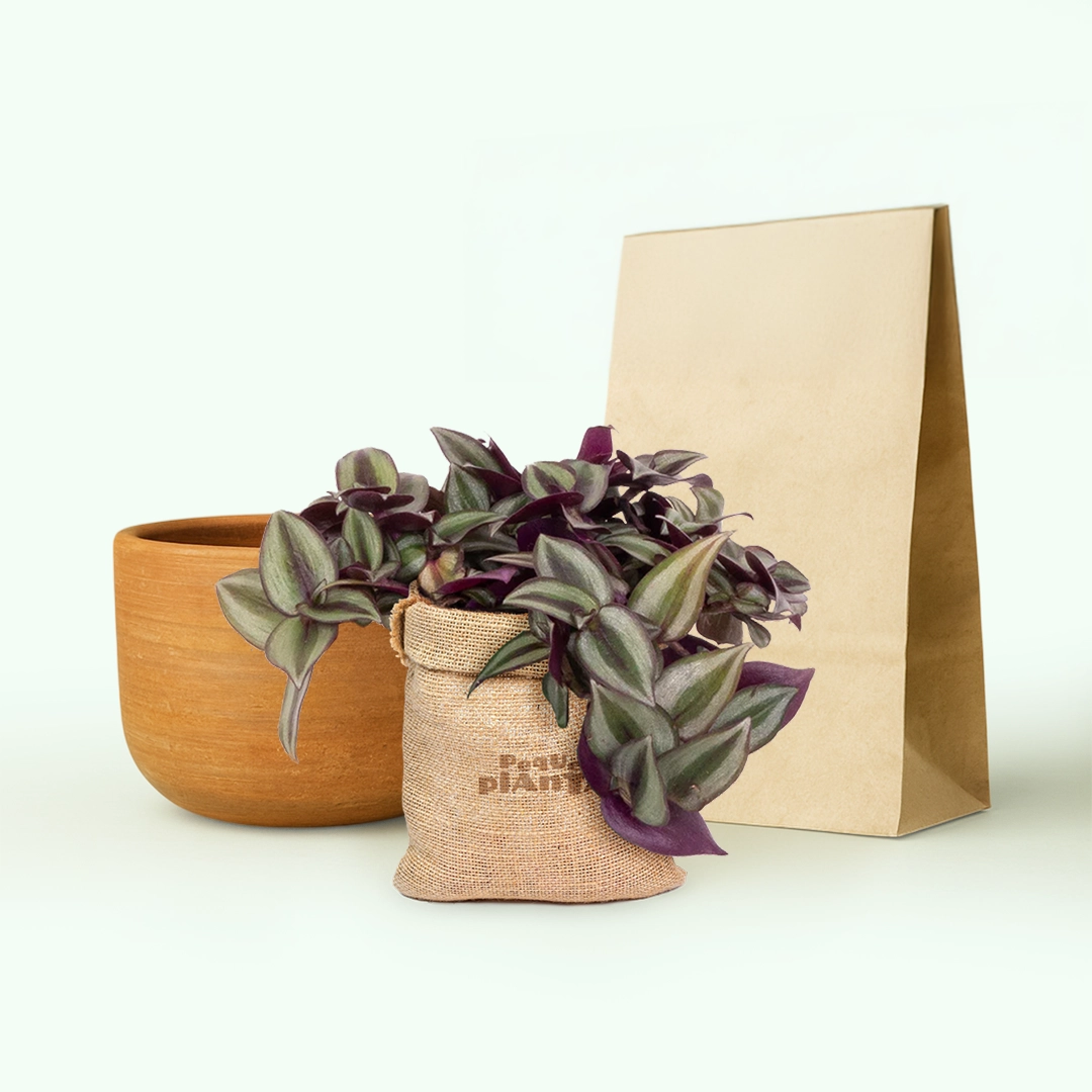 Cada set incluye una Tradescantia Zebrina de aproximadamente 20cm de altura, perfectamente anidada en una bolsa de arpillera para conservar la humedad en su traslado. También incluye una maceta de barro artesanal que mide aproximadamente unos 12cm de alto y 15cm de diámetro, ideal para colocar en cualquier rincón de tu hogar u oficina. Además, recibirás 1 litro de nuestro sustrato, diseñado para proporcionar el equilibrio perfecto de drenaje y nutrición para la Tradescantia Zebrina.